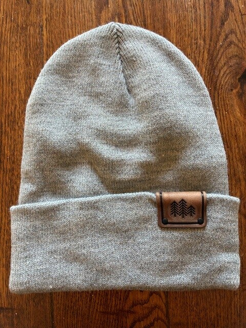 Gray baby hat with brown logo